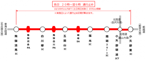 (1)E41 東海北陸道(能越道含む) 飛驒清見IC~小矢部東IC(上下線・約70㎞) 10月19日(月)および20日(火) 各日20時から翌6時まで(2夜間) 〔予備日〕10月21日(水)から10月27日(火)まで 同時間帯 (2)E41 東海北陸道 飛驒清見IC~小矢部砺波JCT(上下線・約68㎞) 10月21日(水)から10月29日(木)まで 各日20時から翌6時まで(7夜間) 〔予備日〕10月30日(金)から11月6日(金)まで 同時間帯 (3)E41 東海北陸道 飛驒清見IC~白川郷IC (上下線・約25㎞) 10月30日(金)から11月4日(水)まで 各日20時から翌6時まで(3夜間) 〔予備日〕11月5日(木)から11月9日(月)まで 同時間帯 ※月曜日~金曜日の平日夜間に通行止めを実施いたします(土日祝日の夜間は実施いたしません)。 ![]() |
