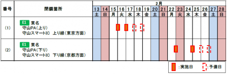 (1)E1 東名 守山PA(上り)・守山スマートIC(上り線) 2021年2月15日(月)、2月16日(火)各日20時から翌6時まで 予備日:2月17日(水)、2月18日(木)いずれの場合も同時間帯 (2)E1 東名 守山PA(下り)・守山スマートIC(下り線) 2021年2月22日(月)、2月24日(水)各日20時から翌6時まで 予備日:2月25日(木)、2月26日(金)いずれの場合も同時間帯 ![]() |