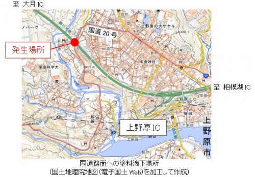 橋梁の塗装作業に用いる塗料が工事足場内から滴下したことにより、当該橋梁下の国道20号を走行中の車両4台(確認中)に付着したもの。