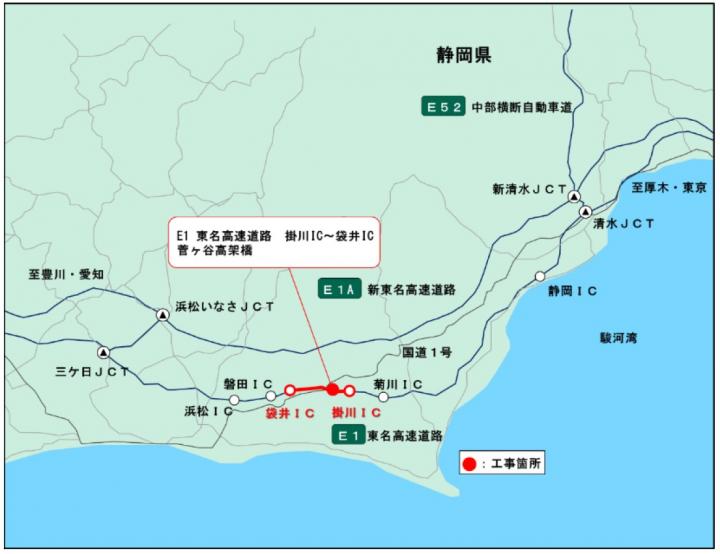 E1 東名リニューアル工事(掛川IC~袋井IC間、菅ヶ谷高架橋)で2023年2月27日から3月10日まで、交通運用を切り換えます ~渋滞が予測されますので、E1A 新東名などへの迂回にご協力ください~