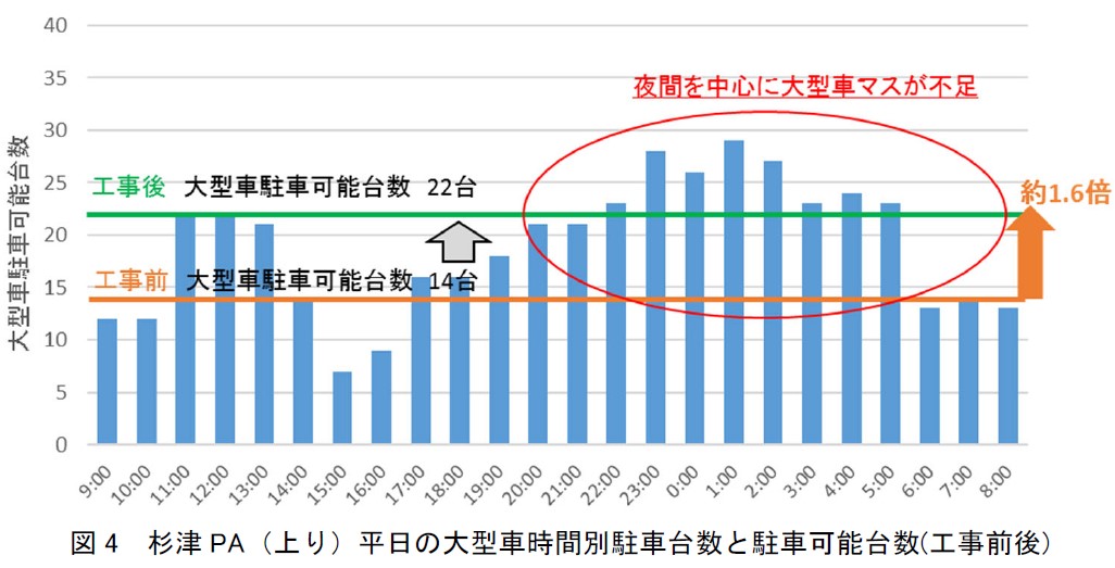 大型車駐車可能台数は工事前14台から工事後22台となります。