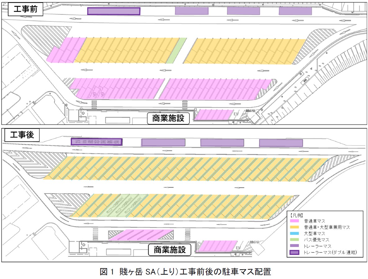NEXCO中日本 金沢支社は、高速道路のサービスエリア(SA)・パーキングエリア(PA)において、平日の夜間を中心に大型車の駐車マスが不足し駐車エリアが混雑していることから、E8 北陸自動車道(北陸道)の賤ヶ岳SA(上り)および杉津PA(上下)で、駐車マスの増設工事をおこないます。