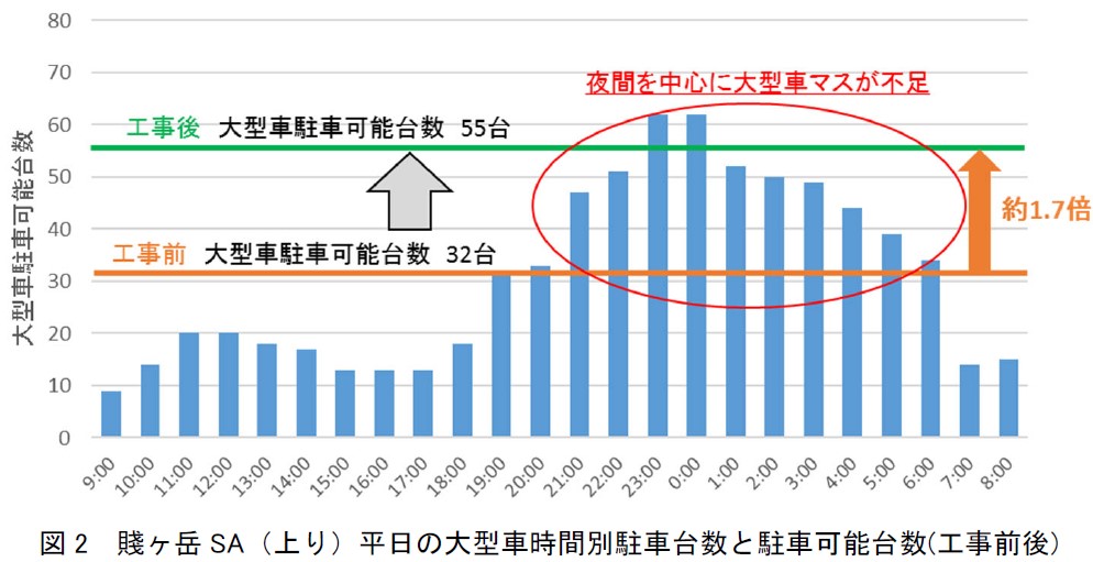 大型車駐車可能台数(大型車+トレーラー)は工事前32台から工事後55台となります。