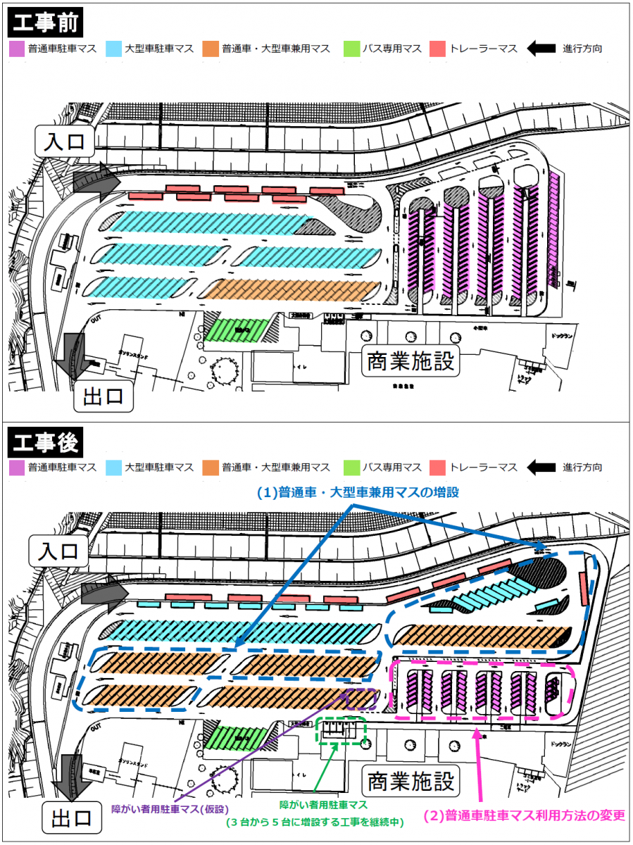 今回の工事では、既存敷地の有効活用により駐車エリアを拡大し、全体レイアウトの変更により普通車と大型車のどちらでもご利用いただける「普通車・大型車兼用マス」を増設することで、大型車駐車可能台数は約1.5倍(+45台)に増加します。