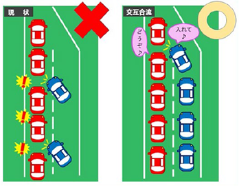 混雑の偏りを少しでも減らすため、混雑時は、車線が減少する地点の先頭までお進みいただき、ゆずりあって1台ずつ合流する「交互合流」にご理解とご協力をお願いいたします。