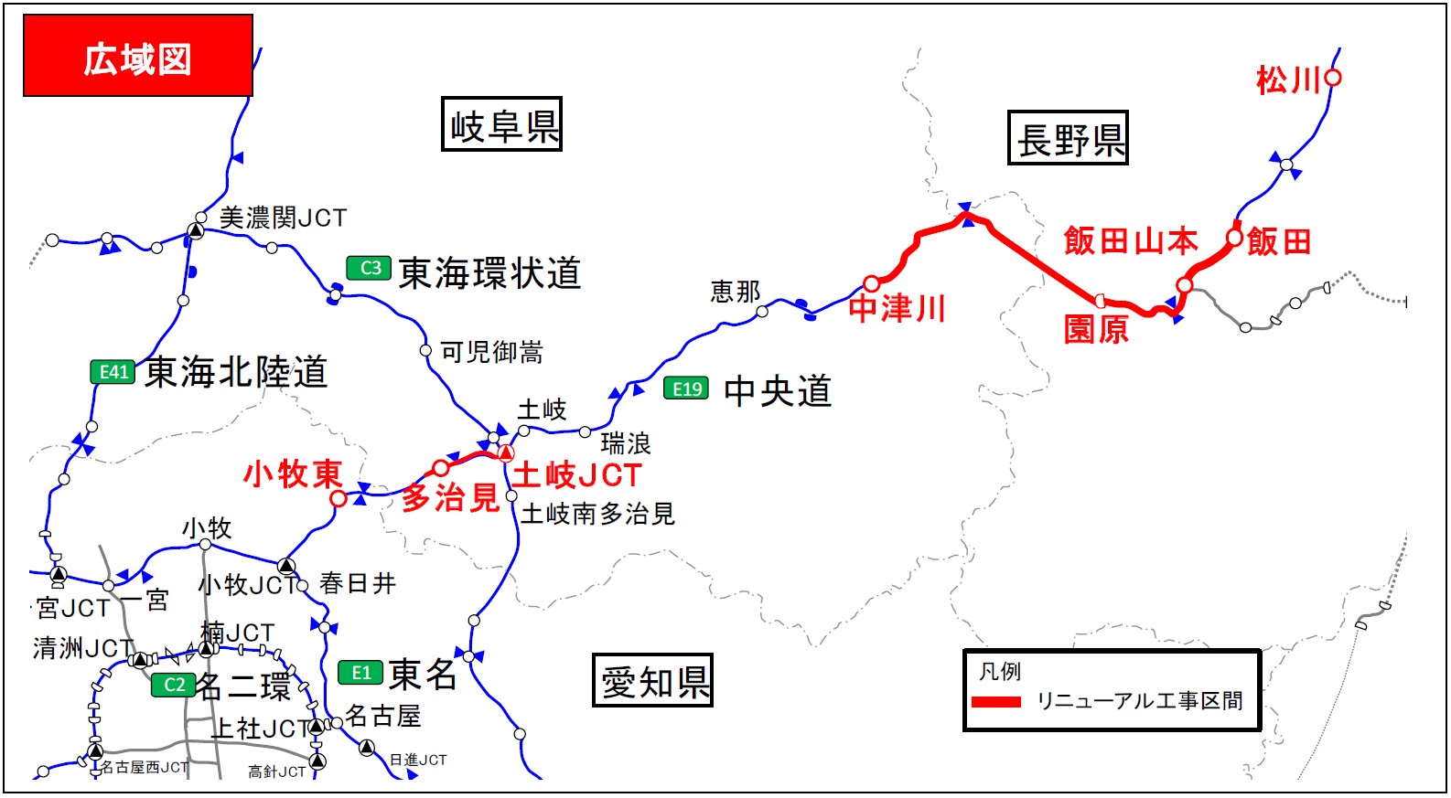 E19 中央道(土岐JCT~小牧東IC、松川IC~中津川IC)でリニューアル工事(昼夜連続・車線規制、対面通行規制など)を実施します2024年5月7日(火)10時から12月16日(月)24時まで ~一般道への迂回やお出かけ時間の変更をお願いいたします~