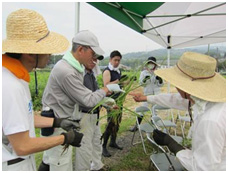 最初に、地元の方から稲と稗の違いについて説明をいただきました。葉の出るところに、細かい毛が生えているのが稲で、生えていないのが稗だと教えていただきましたが、一見しても全く区別がつきません。稲と稗を間違えないよう、参加者一同、慎重に作業に入りました。
