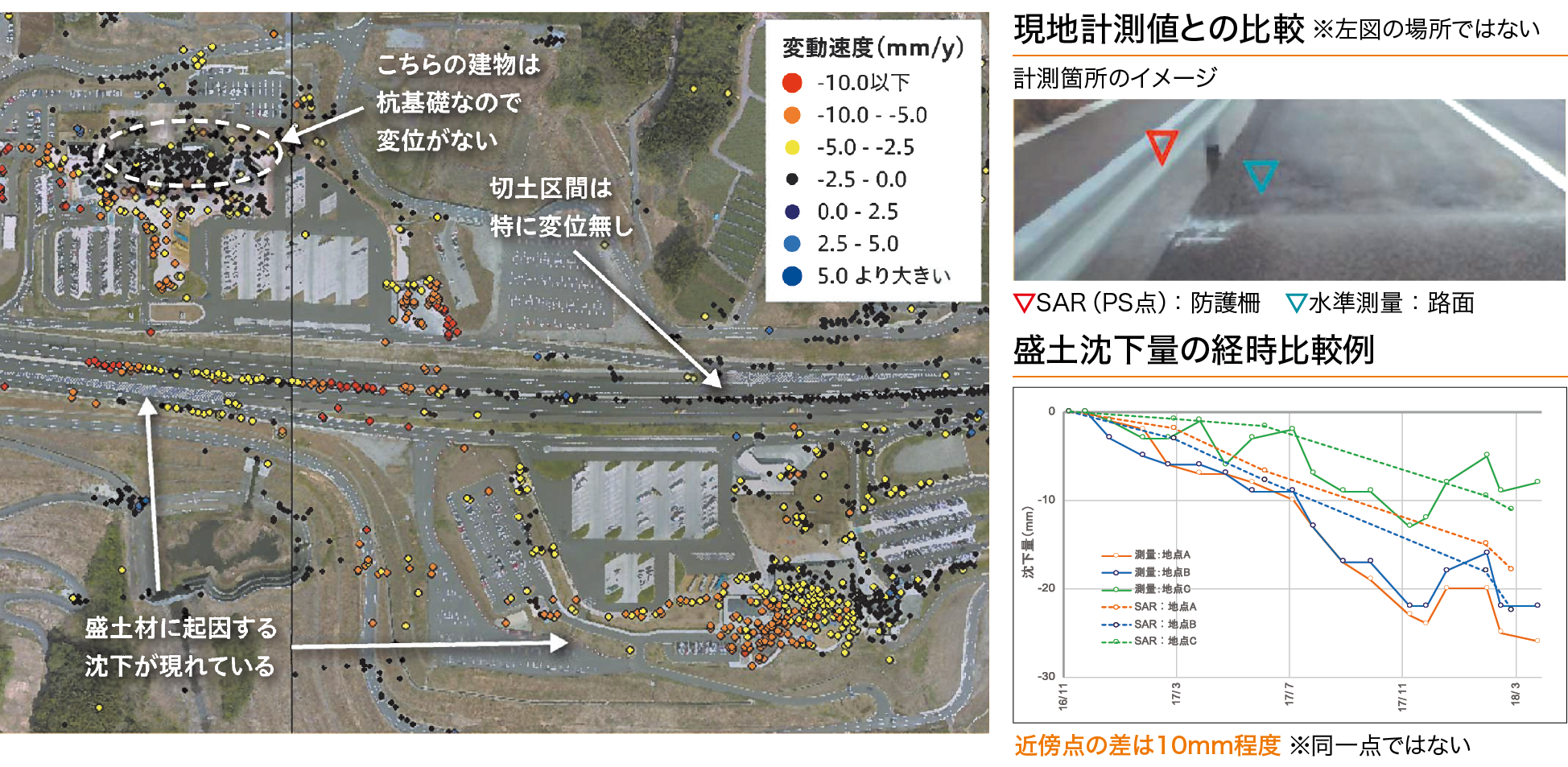 SARの解析技術は、日々変化し続ける挙動を過去に遡って把握することができるため、インフラ等の土構造物の維持管理に向いています。解析結果の見方や解釈は、現地状況や既設調査結果等の情報と経験が必要となりますが、高速道路の土構造物での解析実績で培ったノウハウから、これらをご提案することができます。