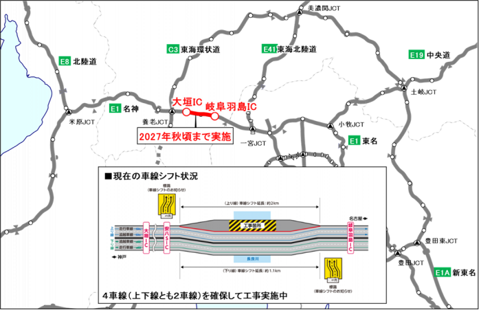 当該リニューアル工事は、2021年8月から、4車線(上下線とも2車線)を確保して工事を実施しております。工事期間中は、長良川橋の前後を含む約2kmの区間で車線シフト規制を継続します。車線および路肩の幅が通常より狭くなっています。標識などの案内をご確認いただき、規制速度を守り、安全に走行してください。
