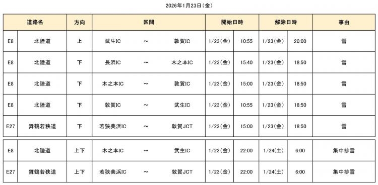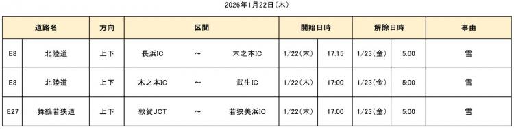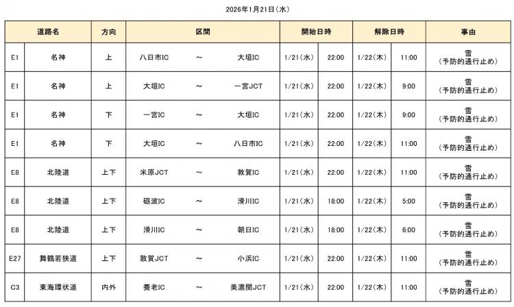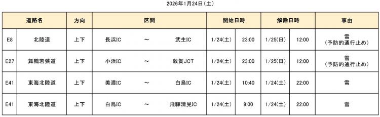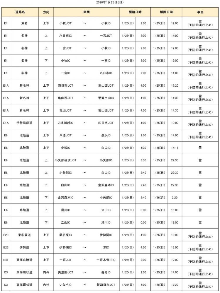 大雪の影響で、2026年1月21日(水)18時から当社管内の一部区間で通行止めを実施しておりましたが、26日(月)2時20分までに全区間の通行止めを解除しました。 通行止めにより、ご利用のお客さまには大変ご迷惑をおかけいたしました。
