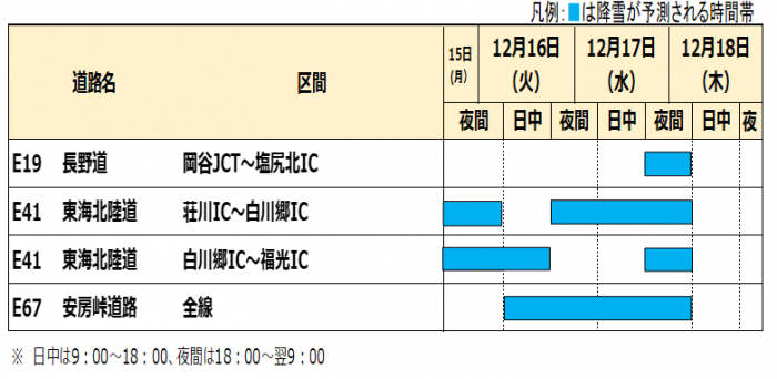 12月15日(月)夜間から当社管内の以下の区間で、降雪が予測されています。