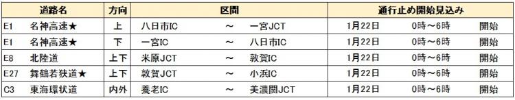 以下の区間以外においても、北陸地方・岐阜県(東海北陸道)・滋賀県(新名神)を中心に大雪が予測されており、降雪状況によっては、冬用タイヤ規制に伴うタイヤチェックや通行止めを実施する可能性があります。